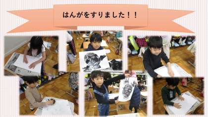 子ども達はバレンや指で絵具を版画用紙にうつしました。