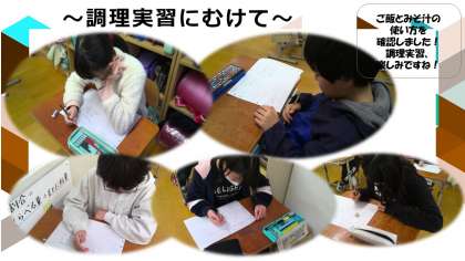 家庭科では、食べて元気!ご飯とみそ汁の学習で調理実習に向けて、ご飯とみそ汁の作り方を確認しました。