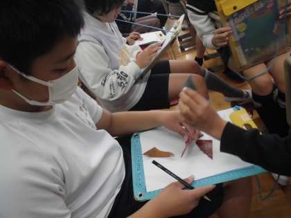子どもたちは今までにモノづくりの殿堂の活動等、ものづくりの思いについて考えを深めていました。今日は革職人の先生が革製品や思いなどを伝えに来てくださいました。写真からもわかるように、興味津々にモノづくりに対して関心をもっています。実際にモノづくりに携わる方の声を聴くことで、子どもたちのこれからへとつながっていけばと思います。