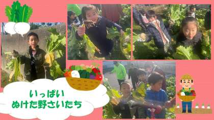 畑の先生方と2学期に植えた大根とかぶの種が立派に育ち,大きな実になりました。
