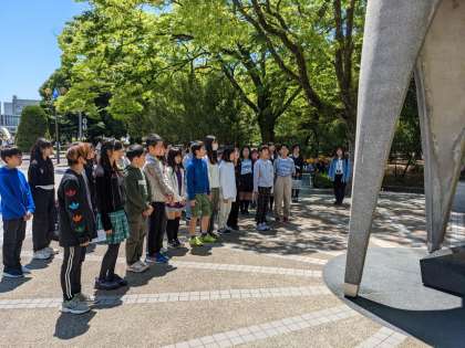 昼食の前に、原爆の子の像の前で平和集会をしました。代表の人が平和への決意を述べたあと、みんなで黙祷を捧げました。