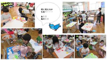 図工の学習では、やぶいたかたちから、何に見えるかを想像し絵をかきました♪
