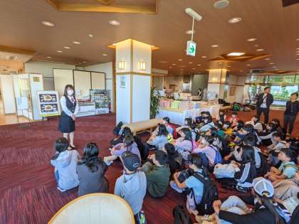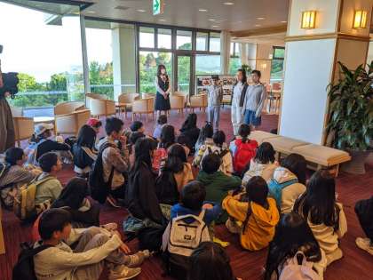 ほぼ予定通りの時刻に、良寛荘に到着しました。まずはロビーで入館式をしました。明日の朝まで、お世話になります。よろしくお願いします。