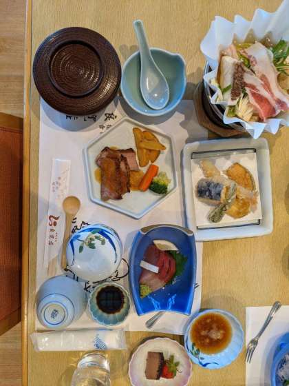 とっても豪華!てんぷらに、お刺身に、ステーキに…。どれから食べようか迷ってしまいます。みんなで食べる修学旅行の夕食の味は格別です!
