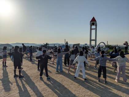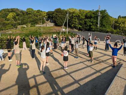 外の展望台で朝の集いです。ラジオ体操をしています。やっぱりちょっと寒いです。子どもたちはみんな元気、ですが、まだちょっと眠そう…