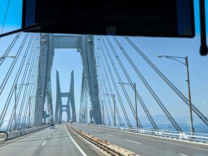 バスは瀬戸大橋をわたっていよいよ四国へ入ります。渋滞により、水族館到着は20分ほど遅れてしまいそうです。