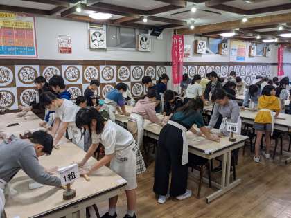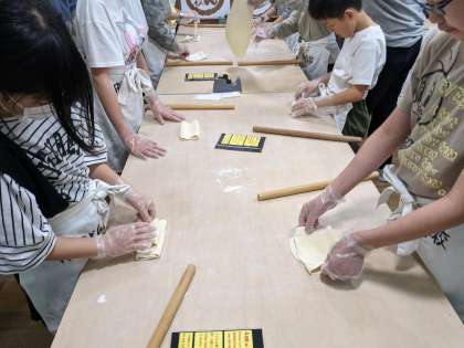手で押して、めん棒で伸ばしていきます。結構硬いですが、みんな上手に伸ばしています。