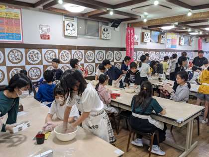 お土産のうどんを作らせていただいたあとは、生地作りの体験もしました。小麦粉をこねて、足で踏んでいきます。音楽に合わせて、みんなノリノリでした!