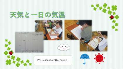 2日の気温の変化を比べて見て、子ども達は気温の違いや、変わり方の様子の違いに気付き、「晴れている日は暑いな」「曇りだから気温が上がらないね」という発言が聞こえてきました。