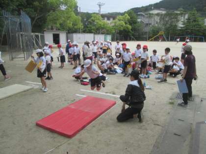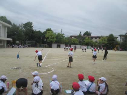 ソフトボール投げ・立ち幅跳び・反復横跳びの3種目の体力テストを,全校で実施しました。かがやきグループ(縦割りグループ)に分かれて,1年生と6年生,2年生と5年生,3年生と4年生がそれぞれペアになり,協力しながら行いました。