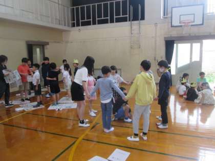 1年生が入学して,1ヵ月以上がたちました。今日は,全校で「1年生を迎える会」を実施しました。6年生に手をつないでもらって,一人ずつ名前を呼んでもらった1年生は,元気いっぱい。縦割りの「かがやきグループ」で遊んだり,全校で歌を歌ったりして,楽しい時間を過ごしました。