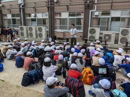 いよいよ始まります。まずはピロティで出発式をしました。みんな元気いっぱいです!他の学年の人たちもたくさん見送りに来てくれました。楽しい思い出をたくさん作ってきます。