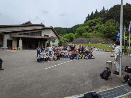山の家の本館をバックに、集合写真を撮りました。薄日がさしてきて、絶好の野外活動日和です。これから山の家の敷地内でスコアオリエンテーリングをする予定です。