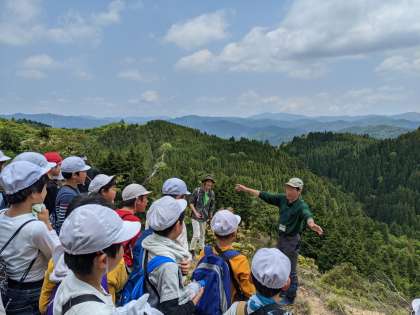 頂上には素晴らしい景色が待っていました。急な坂道もみんなで励まし合いながら頑張り切ることができました。標高910m雲取山北峰、到着です!