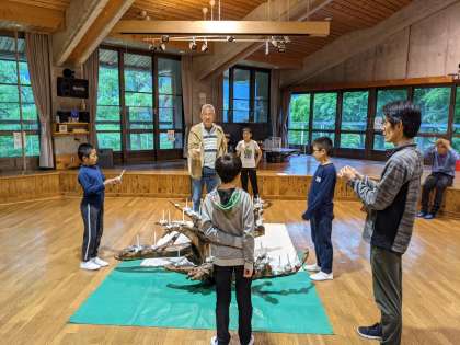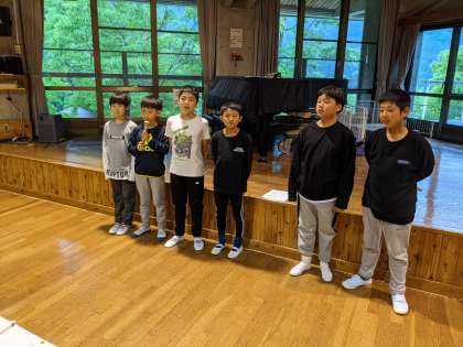 レクレーション係の子どもたちが先に集まって、キャンドルファイヤーの準備をしています。このあと、みんなで盛り上がります!