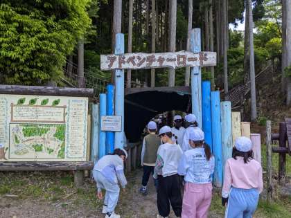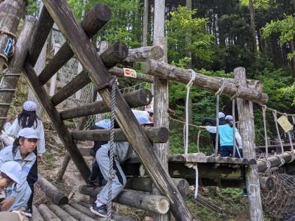 本館の近くにあるアスレチック施設「冒険の森」で活動しています。風が強くてじっとしていると少し寒いぐらいですが、よく晴れています。
