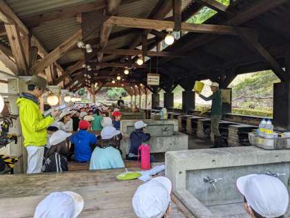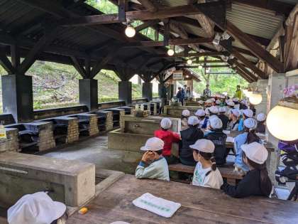 いよいよ山の家での最後のプログラム、野外炊事です。野外炊事場に移動して、山の家の先生から説明していただいています。みんなで協力して美味しいカレーを作ります。