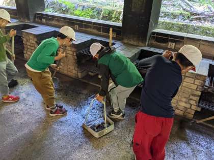カレーの鍋の内側や、鍋の外側のすすをきれいにするのは大変です。かまどの掃除も苦労します。後片付けまでみんなで頑張りました。野外炊事、大成功です。