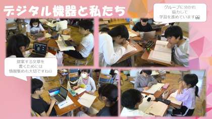 この単元では身の回りにあるデジタル機器に関しての課題をグループになって話し合い、どのような使い方が良いのかを提案する文章を書くことを目指して日々活動に取り組んでいます。
