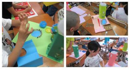 二年生では、カッターを使ってまどを作りました。今日は、作った家の周りにあるものを作りました。池や公園、滑り台など、工夫しながら作っています。
