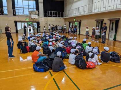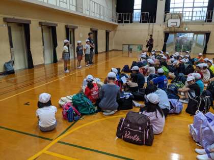 いよいよ楽しみにしていた若狭湾少年自然の家での野外活動に出発します。雨が降っているので体育館で出発式をしました。素敵な2日間になりますように!