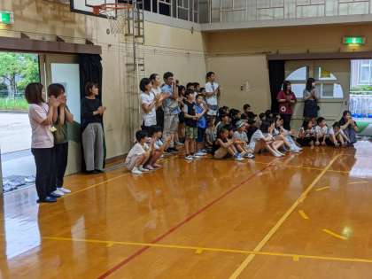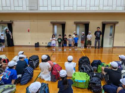 出発式をしていると、体育館に1年生の子どもたちが「行ってらっしゃい」のメッセージを伝えに来てくれました。他にも、4年生以外の学年の子どもたちがたくさん見送りに来てくれました。保護者の方だけでなく、とてもたくさんの人たちに見送っていただいての出発です!