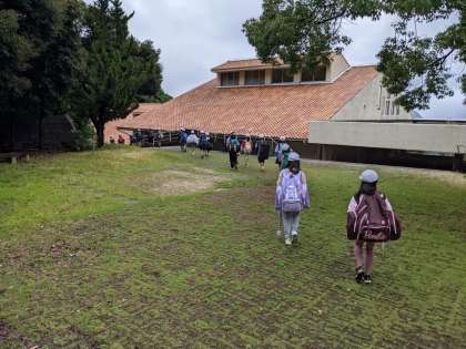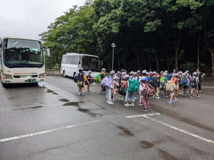 ほぼ予定通りに若狭湾少年自然の家に到着しました。バスから降りた時は雨がやんでいて、傘を使わずに本館まで移動することができました。今から入所式です。