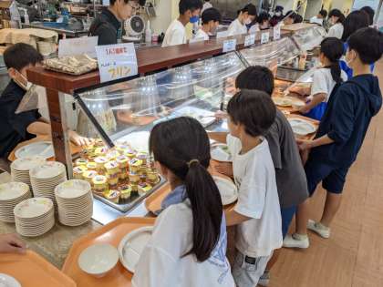 自然の家ではじめていただく食事です。バイキング形式でとってもおいしいです。しっかり食べて午後からの活動に備えます。