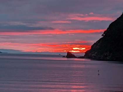 キャンプファイヤーが終わる頃、海の向こうの水平線に、少しだけですが美しい夕焼けが見えていました。明日も雨が降らずに予定通りの活動ができますように。