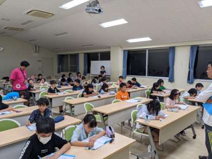 キャンプファイヤーのあと、お風呂を済ませ、研修室で今日一日の振り返りをしています。今日がんばれたことと、明日もっとがんばりたいことをみんなで出し合いました。