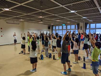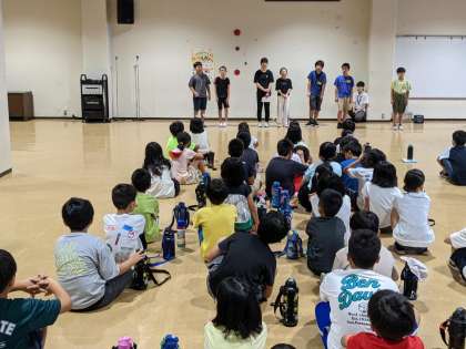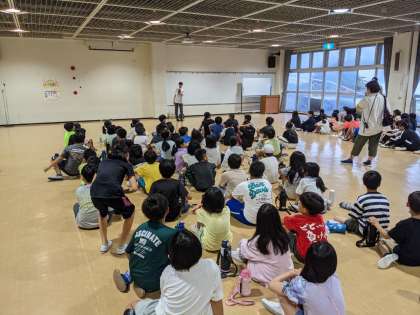 7時から館内のプレイホールで朝の集いをしました。自然の家に宿泊している他の学校と合同で実施しました。代表の人が学校の紹介もしてくれました。