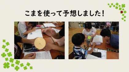 算数では、新しい単元へ入りました。「円と球」の学習を楽しみにしている様子がありました。いろいろな形のこまを使ってどのような形になるのかを予想して試しました。どんな形でも回すと、円の形になることに気づいていました。コンパスを使い始めますので、ご用意ください。