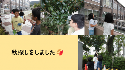 国語科「秋のくらし」の学習で行う、第3回俳句選手権に向けて秋探しをしました。校門横にあるキンモクセイの香りを嗅いだり、紅葉したハナミズキをみつけたり、落ち葉を拾って触って感触を確かめたりしていました。初めてキンモクセイの匂いを嗅いだ子が多く、「いい匂いがする」「落ち着く匂いがする」という声が聞こえてきました。「匂いは嗅いだことがあったけど、キンモクセイの匂いだと知らなかった。」という子もいました。
