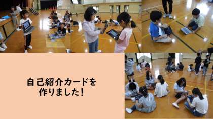 外国語活動では、自分の名前の頭文字のアルファベット伝え合い、自己紹介カードを作りました。最後にはみんなの前で、自己紹介と作った自己紹介カードを発表しました。交流の中でも、相手に伝えるための工夫をそれぞれが考えて友だちに声をかけていました。「〜card,please.」と自分の欲しいものを相手につたえるための表現にも慣れ親しむことができました。