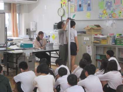 今日から,学年ごとに身体計測を始めています。今日は6年生と4組の子どもたちが実施しました。最初に養護教諭の井上先生からお話をしていただいてから,身長や体重を計測します。去年に比べてどれだけ大きくなっているか楽しみですね。