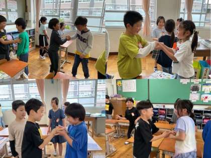 外国語活動では、英語で友達に挨拶をしたり、名前を言ったりしています。はじめは恥ずかしそうに話していた子も、時間が経つにつれ笑顔で活動に参加することができるようになっていました。相手により伝わるための工夫はどんなことがあるかを考え、それぞれが目標をもち取り組む姿も見られました。学習のふりかえりでは、伝えるための工夫をしたことで自然と友達が笑顔になっていたことに気づき、工夫することのよさを感じていました。