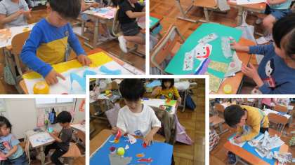 立体的な作品を作る子や、画用紙をはみ出して大胆に貼っていく子など、それぞれの個性があるれる作品になりました。