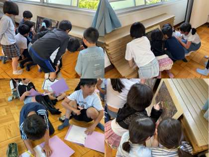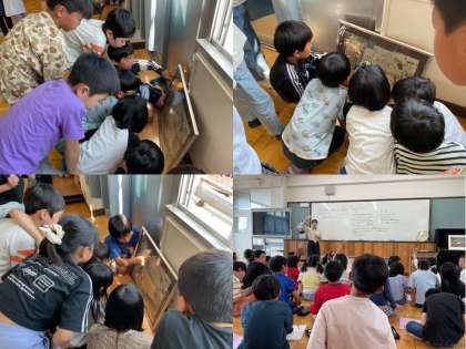 総合的な学習の時間に、陵ヶ岡小学校の航空写真を見ながら、学校の様子がどのように変わっているのかを見ました。「何年と何年は同じ」「何年からここが変わった」など、写真を見て様子の移り変わりに気付いていました。もっと陵ヶ岡小学校のことを知りたいという気持ちが大きくなってきました。