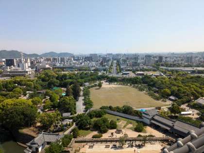 急な階段をたくさん登って、やっと天守閣の最上階に着きました!涼しい風がとても気持ちいいです。姫路の街が一望できます!