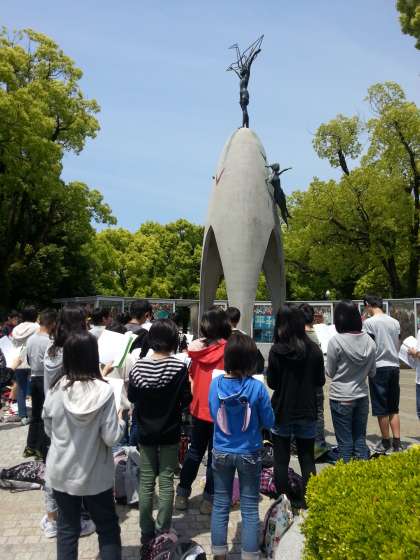 1日目は,広島平和記念公園で,原爆ドームの見学,平和記念資料館の見学,そして被爆者の語りべの方から,貴重なお話を聞きました。また,原爆の子の像では,平和集会を行い,みんなで折った千羽鶴を供えました。これからバスに乗り,全員元気に岡山倉敷に向かいます。