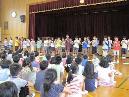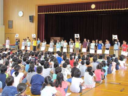 朝会では,校長先生から「友だちと力を合わせる」というお話がありました。これから運動会や学習発表会,5年生は花背山の家の野外活動など大きな行事がたくさんあります。クラスや学年の友だちはもちろん,かがやきグループ(たてわりグループ)の友だちとも力を合わせて取り組んでいってほしいと思います。