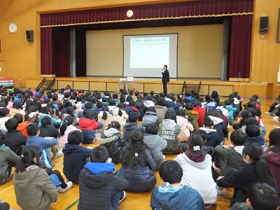 震度4以上の地震が起こったという想定のもと,児童たちが教室以外の場所からでも適切に避難行動を取ることができました。