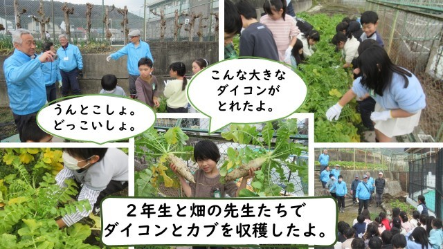 2年生 畑の先生たちとダイコン・カブの収穫をしたよ