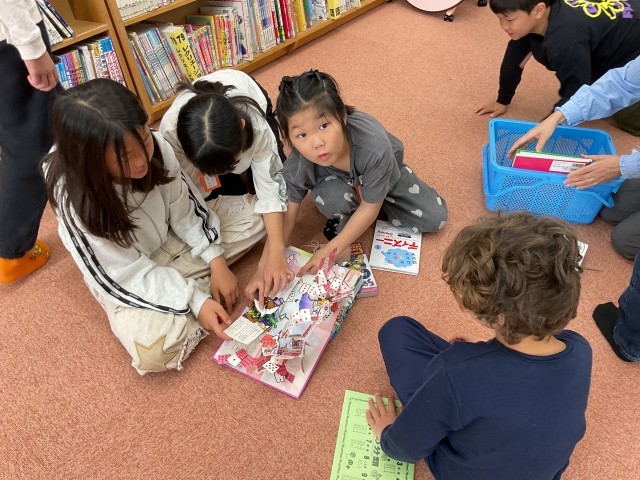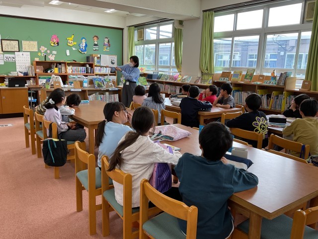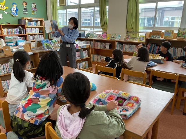 図書館開きとして、司書の先生から「ポプラディア」についてのお話と、絵本の読み聞かせをしていただきました。