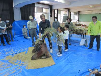 今日は,お米の先生に来ていただき,収穫した稲穂を脱穀をしました。足踏式回転脱穀機を使って,一度にたくさんもみが取れる様子をみて,子どもたちは,歓声をあげていました。この後.もみすり,精米という作業をお米の先生と農家の方にしていただき,いよいよお米が出来上がりです。楽しみですね。