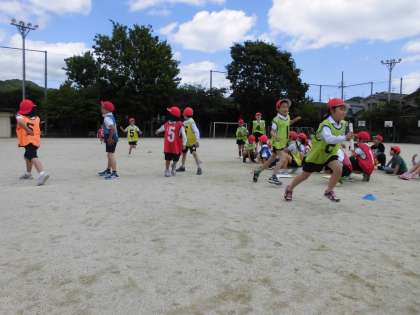 3年体育科「リレー」の1組の様子です。一生懸命「テイクオーバーゾーンの使い方」の作戦を考え,走っています。