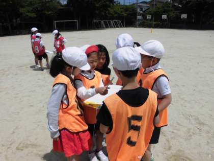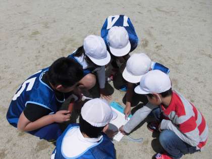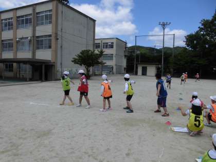 3年体育科「リレー」の2組の学習の様子です。協力して作戦を考えて走っています。走順を待つ姿勢もかっこいいです。