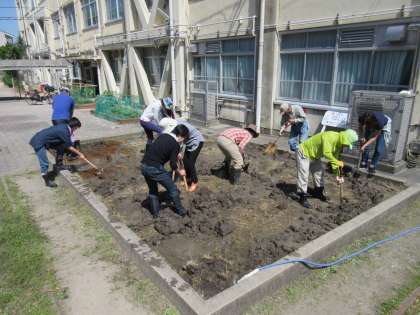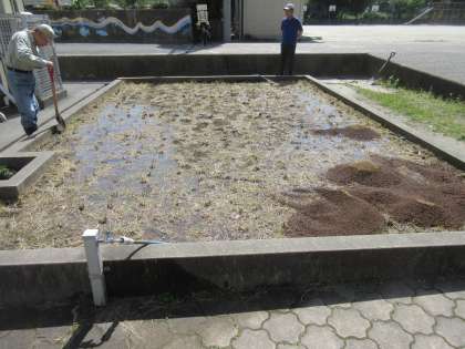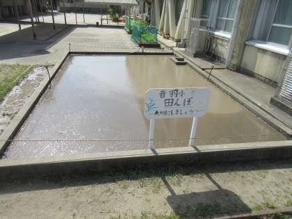 今日は,地域の田んぼの先生や2年生の保護者の方に来ていただいて,田おこしをしていただきました。作業を始める前は,硬かった土も終わるころには,やらかくて田植えに最適なとてもいい土に仕上がりました。地域の先生,保護者の皆様,ありがとうございました。これで,今年も2年生のお米の学習がスタートできます。