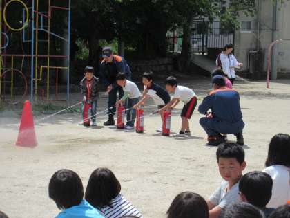 今日は,火災を想定した避難訓練が行われました。山科消防署の方にもご協力もあり,本番さながらの緊張感ある避難訓練でしたが,みんな,先生の指示をよく聞いて,落ち着いて避難することができていました。各学年の代表が,消火器体験をさせてもらいました。日頃から,災害に備えて安全かつ敏速に避難する態度と習慣を身に付けていきたいですね。。