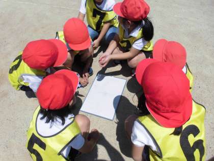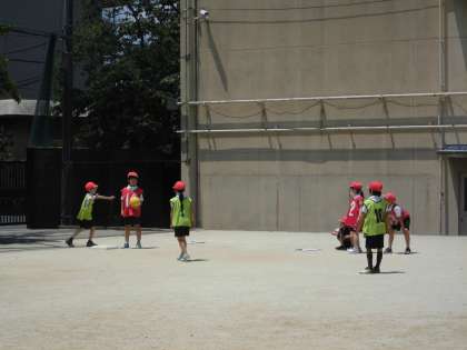 試合のルールにも慣れ,本格的に作戦を考えて試合を行っています。相手の守り方を見て攻め方を工夫をすると得点がたくさん入ることがわかってきました。